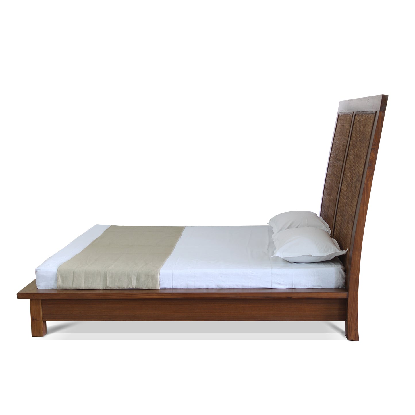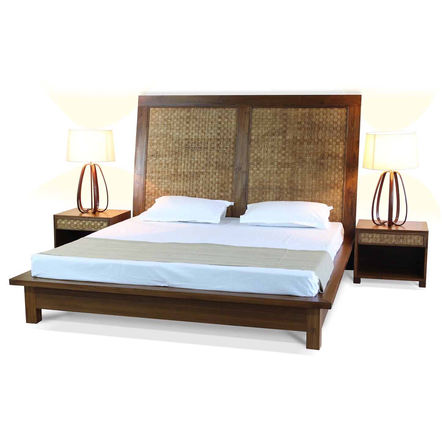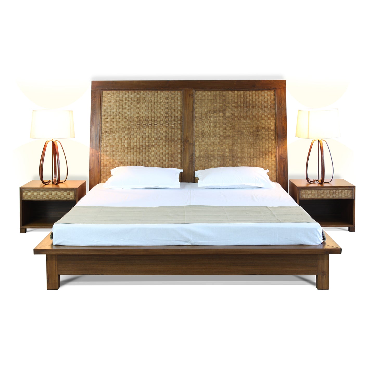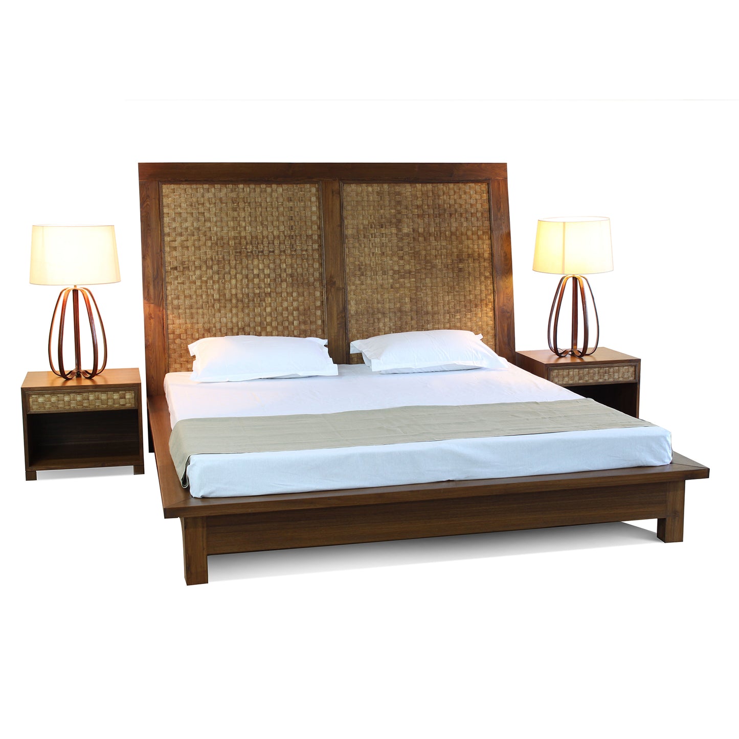 The Leather clad wooden frame of this double bed holds woven veneer strips within it. The rest of the bed is in polished veneer & wood. Lamps and bed side tables are not included in the price.