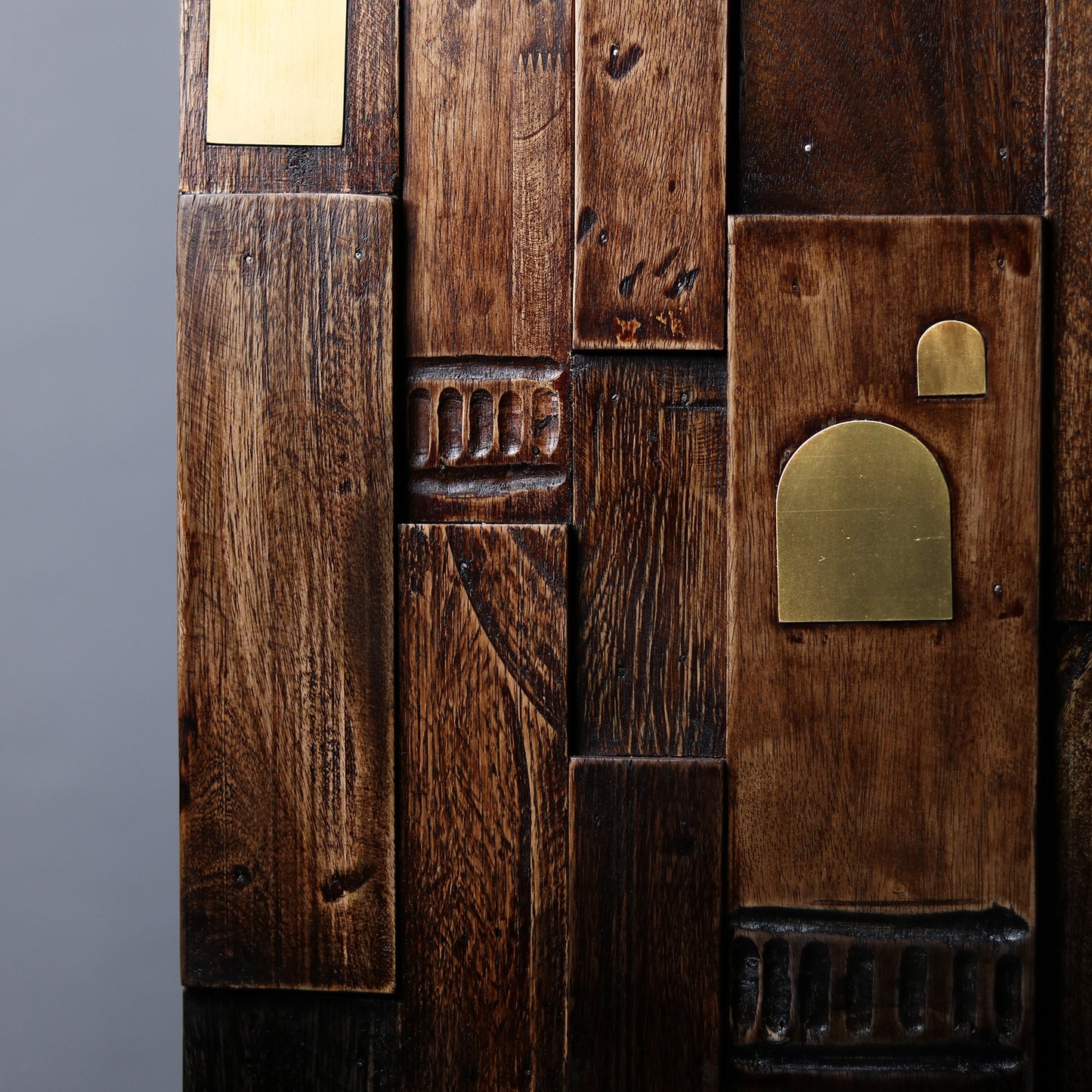 This screen is inspired by and is an abstraction of Girgaon Mumbai's architecture. Depicting tiled roofs, and hints of balconies, carved into the wood and brass accents for windows. The ombre finish on the wood gives the effect of light fading away on buildings as the sun sets and its twilight! This piece is made of various woods and plys found on the shop floor of our factory.