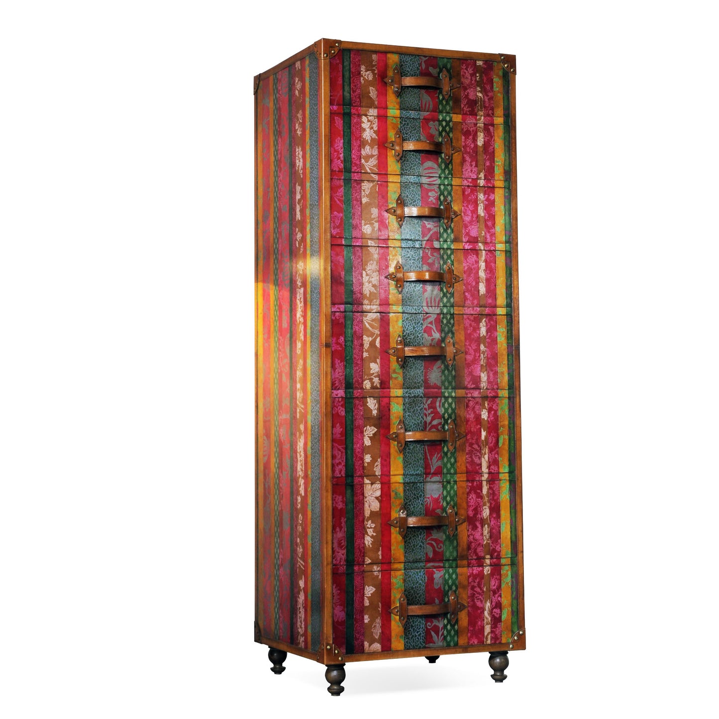 Chest of drawers in strips of printed leather bringing in the joyous colors of Christmas! The 8 drawers are lined with ultra suede and have leather handles for pulls.