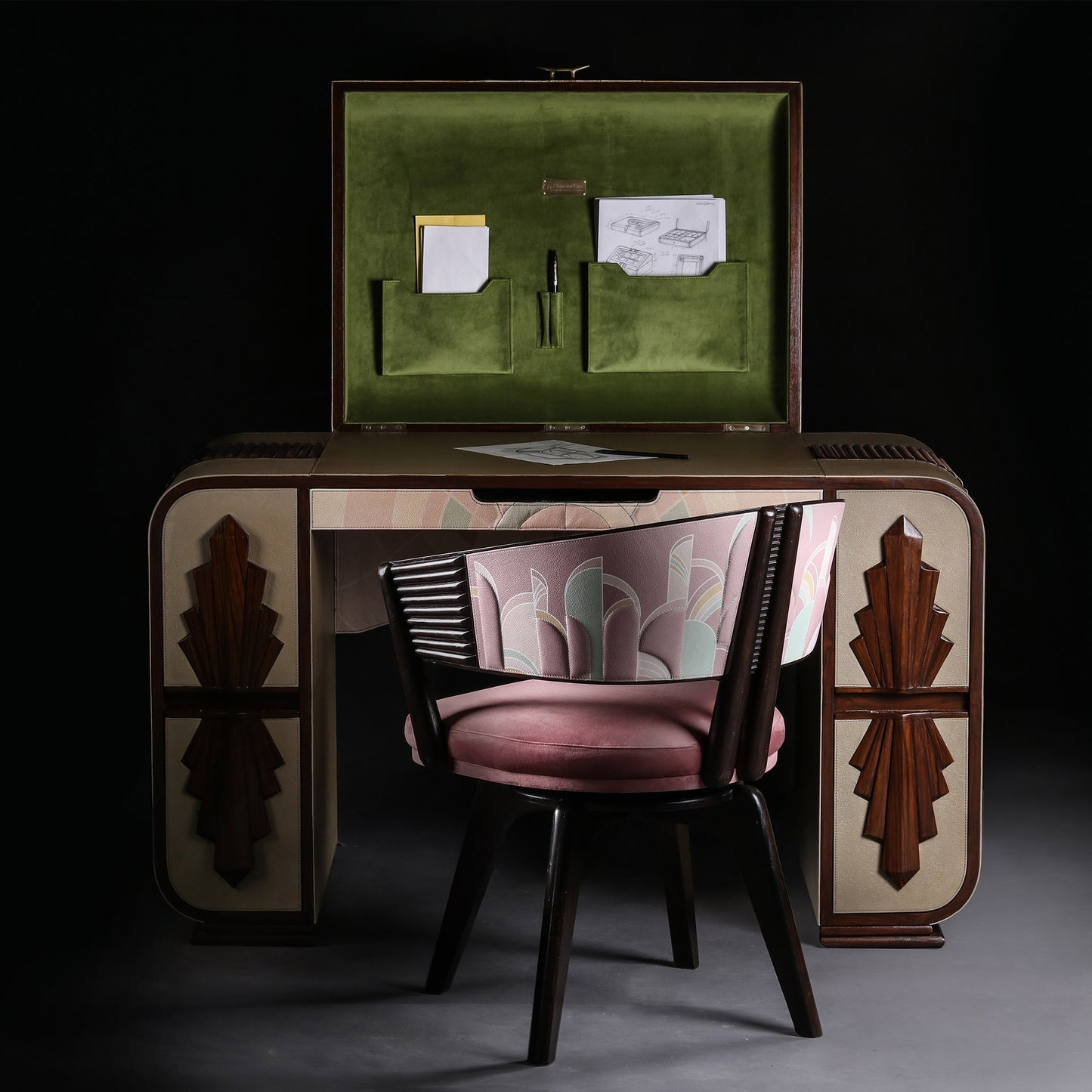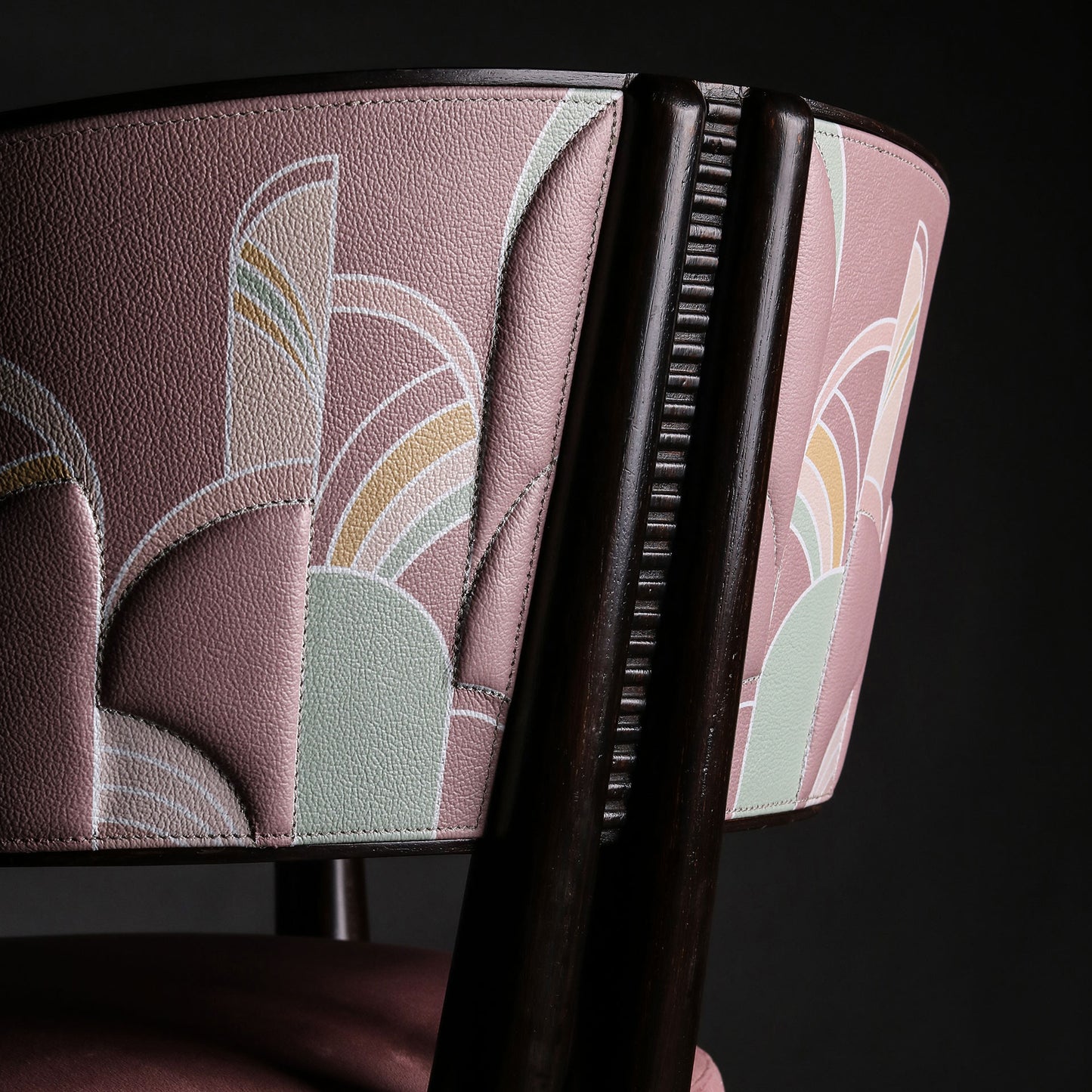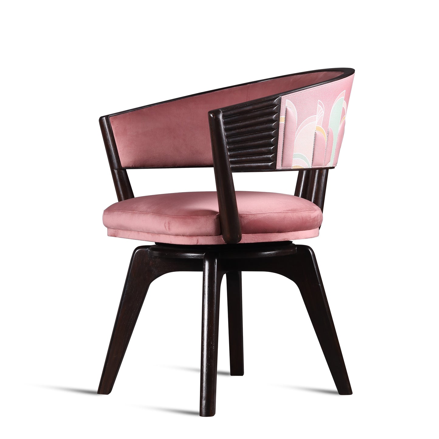 From our marine drive graffiti collection. This Swivel desk chair is made from Teak wood, Printed Leather & Velvet fabric upholstery.