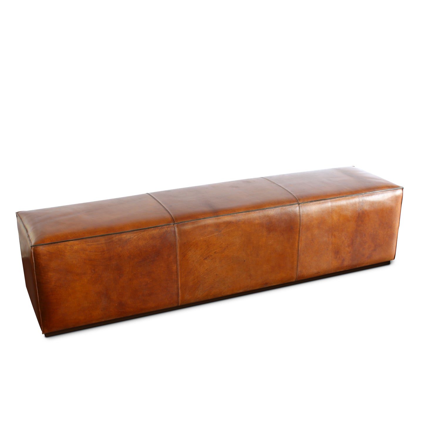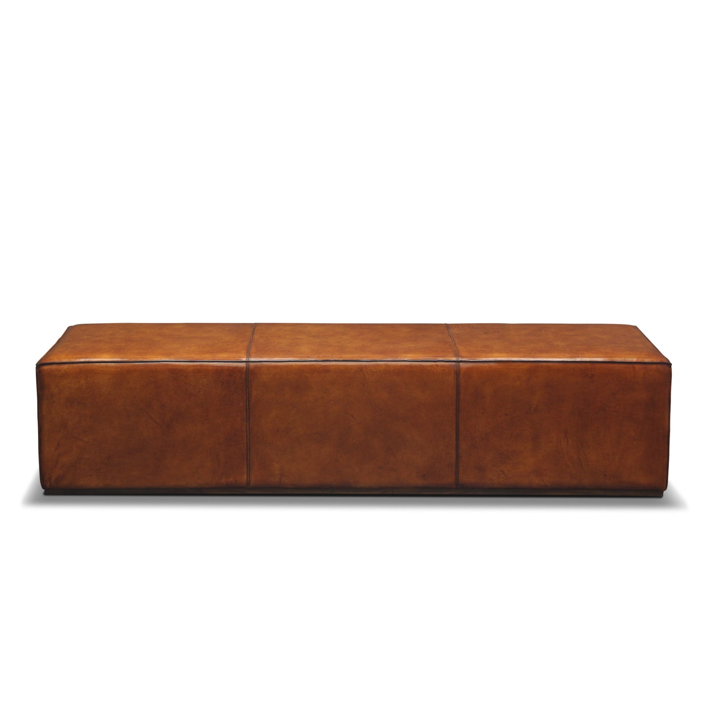 "A long leather bench with hand-stitched details on all four corners, this piece of furniture could work as a bed-end bench and equally well as a room divider."