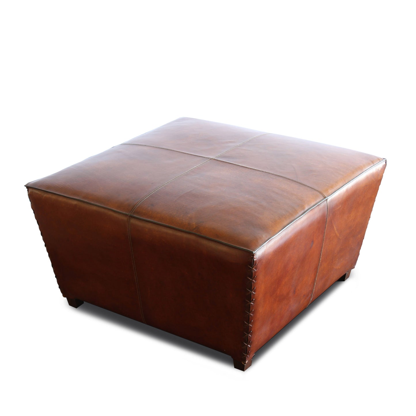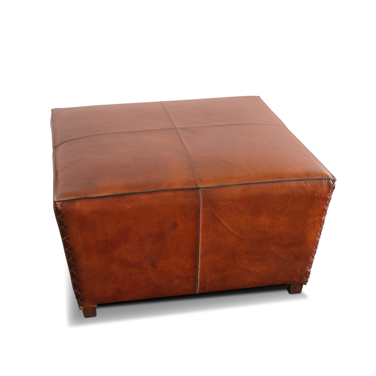 "This square leather pouffe elegantly tapers inwards at the lower end. The corners are held together in a cross stitch made of leather strings. The small legs are in solid wood."