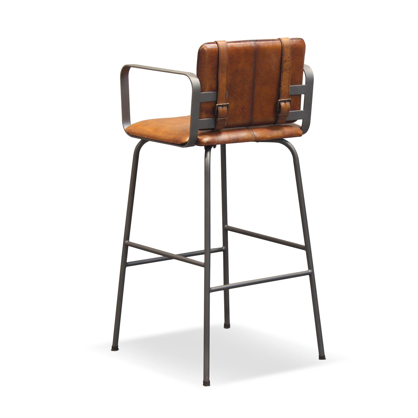 The 'Railway Room Bar Stool' with its finishes and proportions exudes an industrial look. The light antique tan leather finish with the strap detailing on the backrest, and the pewter finished hand rest and sleek metal legs gives a lightweight look to the stool.